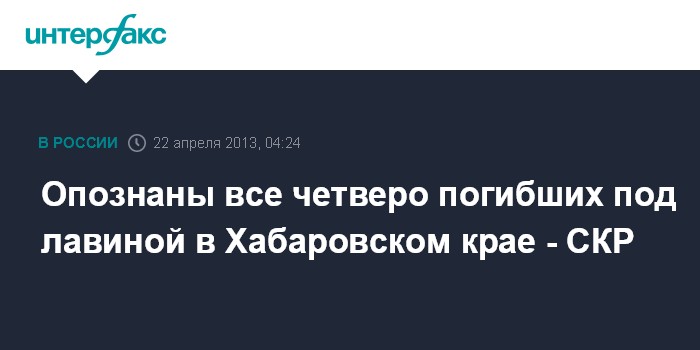 Хабаровск. 22 апреля. ИНТЕРФАКС-ДАЛЬНИЙ ВОСТОК - В Хабаровском крае опознаны тела четырех туристов, погибших под лавиной в Солнечном районе, сообщил в понедельник агентству "Интерфакс-Дальний Восток" старший помощник по взаимодействию со СМИ руководителя Следственного управления СКР по региону Илья Гудков.