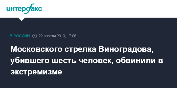 Москва. 22 апреля. INTERFAX.RU - Юрист Дмитрий Виноградов, убивший осенью прошлого года в Москве шестерых человек, обвиняется по трем статьям УК РФ, в том числе в экстремизме, сообщили в СКР.