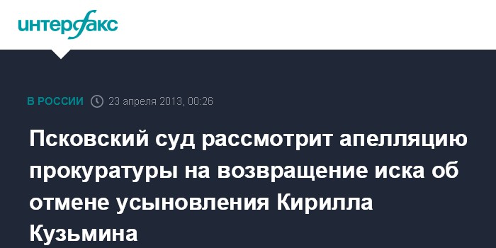 Псков. 23 апреля. INTERFAX.RU - В Псковском областном суде во вторник состоится рассмотрение апелляционного представления прокуратуры о возвращении иска об отмене усыновления в отношении Кирилла Кузьмина, брата погибшего в США Максима Кузьмина.
