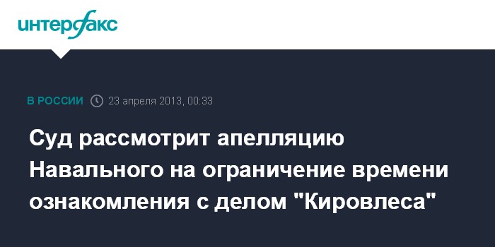 Киров. 23 апреля. INTERFAX.RU- Кировский областной суд во вторник рассмотрит апелляционную жалобу защиты Алексея Навального о незаконном, по его мнению, ограничении времени для ознакомления с материалами его уголовного дела по "Кировлесу".