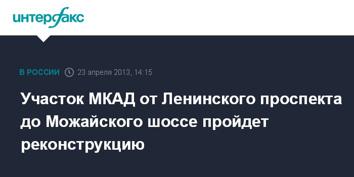 Москва. 23 апреля. INTERFAX.RU - Департамент строительства Москвы объявил конкурс на определение технического заказчика реконструкции МКАД от Ленинского проспекта до Можайского шоссе в Западном округе столицы, сообщили "Интерфаксу" во вторник в пресс-службе департамента.
