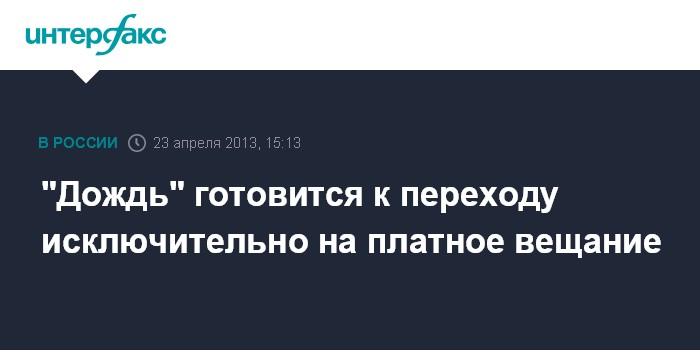 Москва. 23 апреля. INTERFAX.RU - Телеканал "Дождь" в течение двух месяцев может отказаться от бесплатного онлайн вещания и стать полностью платным, заявила "Интерфаксу" гендиректор телеканала Наталья Синдеева.
