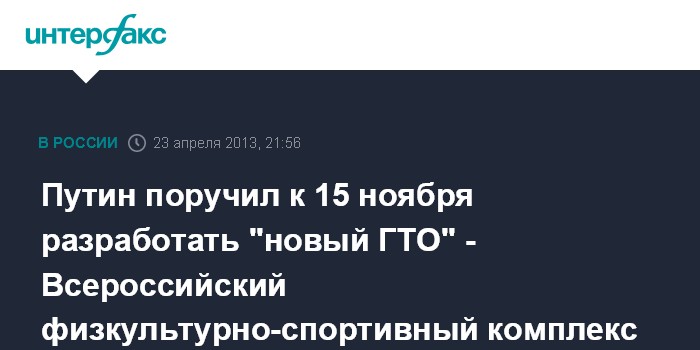 Москва. 23 апреля. INTERFAX.RU - Владимир Путин поручил правительству в срок до 15 ноября 2013 г. разработать и представить Всероссийский физкультурно-спортивный комплекс (ВФСК) на рассмотрение Совета при президенте РФ по развитию физической культуры и спорта.