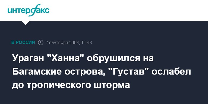Москва. 2 сентября. INTERFAX.RU - Тропический циклон "Ханна", достигший силы урагана, задержался над Багамскими островами и островами Теркс и Кайкос, передал телеканал CNN.