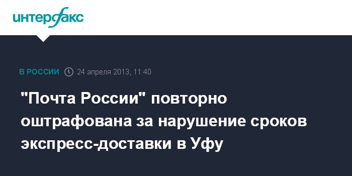 Уфа. 24 апреля. INTERFAX.RU - ФГУП "Почта России" оштрафовано на 30 тыс. рублей за нарушение сроков доставки EMS отправлений.
