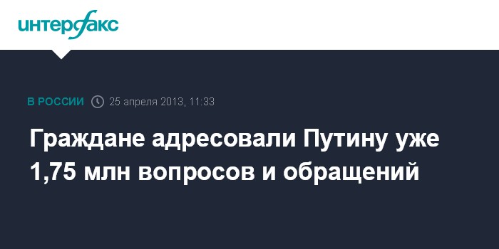 Москва. 25 апреля. INTERFAX.RU - На "прямую линию" президенту РФ Владимиру Путину уже поступило 1 млн 750 тыс. обращений.