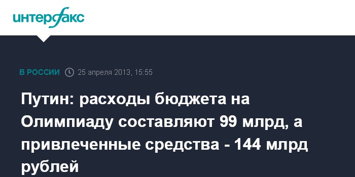 Москва. 25 апреля. INTERFAX.RU - Владимир Путин озвучил официальную сумму средств, выделенных на сооружение олимпийских объектов в Сочи: 99 млрд рублей из бюджета и 144 млрд рублей инвестиций.