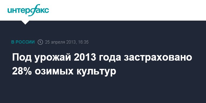По данным Минсельхоза, площадь застрахованных в этом году озимых на 2,2 млн га больше, чем под урожай 2012 года. В прошлом году было застраховано 19% от всей посевной площади.