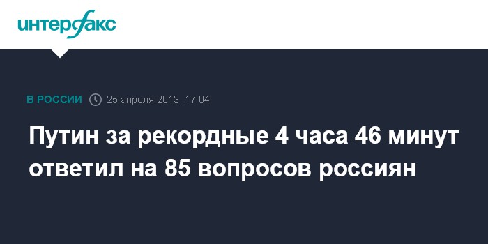 Москва. 25 апреля. INTERFAX.RU - Президент Россиии Владимир Путин побил очередной рекорд общения с гражданами России в формате "прямой линии".
