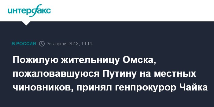 Пожилую жительницу Омска, пожаловавшуюся Путину на местных чиновников, принял генпрокурор Чайка