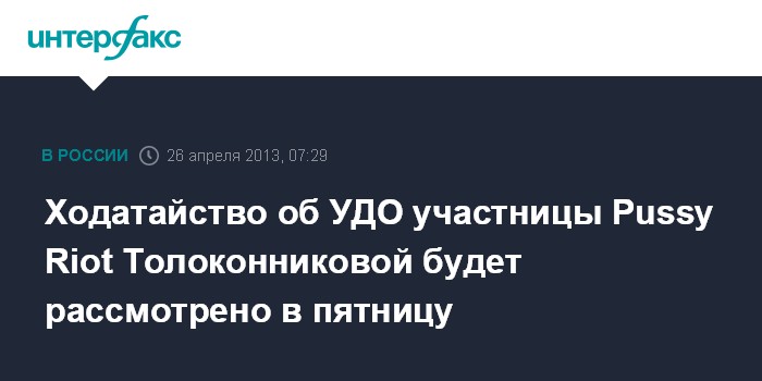 Москва. 26 апреля. INTERFAX.RU - Зубово-Полянский районный суд Мордовии в пятницу рассмотрит вопрос об условно-досрочном освобождении осужденной участницы панк-группы Pussy Riot Надежды Толоконниковой.