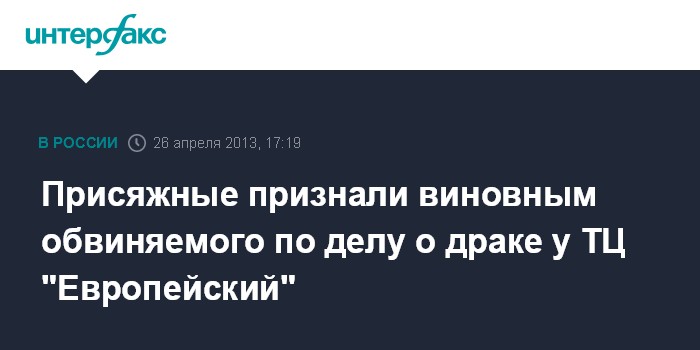 Москва. 26 апреля. INTERFAX.RU - Присяжные в Мосгорсуде единогласно признали Бекхана Ризванова виновным в покушении на убийство из хулиганских побуждений в рамках дела о драке у ТЦ "Европейский", которая произошла летом 2012 года.
