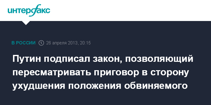 Москва. 26 апреля. INTERFAX.RU - Президент России Владимир Путин подписал закон, позволяющий возобновлять уголовное дело или пересмотреть ранее принятое судом решение, если открылись факты совершения обвиняемым более тяжкого преступления.