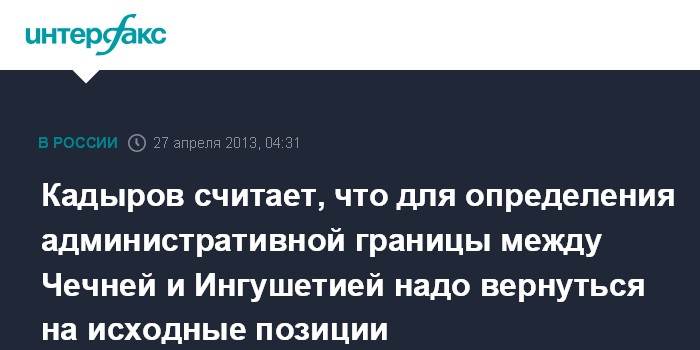 Москва. 27 апреля. ИНТЕРФАКС - Глава Чеченской Республики Рамзан Кадыров заявляет, что для определения административной границы между Чечней и Ингушетией необходимо отменить все ранее принятые сторонами решения и в спокойной обстановке обсудить проблему.
