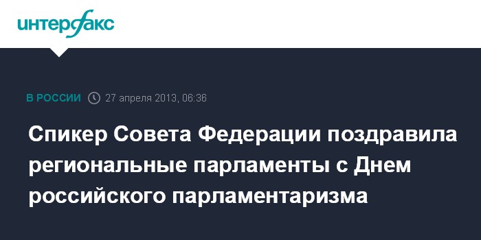 Москва. 27 апреля. ИНТЕРФАКС - Председатель Совета Федерации Валентина Матвиенко в связи с Днем российского парламентаризма направила поздравительные телеграммы руководителям законодательных (представительных) органов государственной власти всех субъектов РФ.