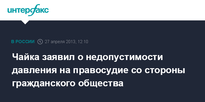 Москва. 27 апреля. INTERFAX.RU - Генеральный прокурор России Юрий Чайка заявил о недопустимости давления на правосудие со стороны гражданского общества. "Каждый должен заниматься своим делом. Когда институт гражданского общества проводит ревизию приговора суда, на мой взгляд, это просто недопустимо", - заявил Ю.Чайка, отвечая в субботу на вопросы сенаторов в Совете Федерации.