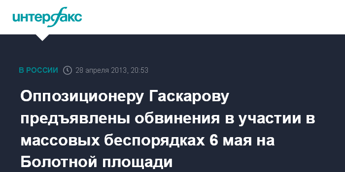 Москва. 28 апреля. ИНТЕРФАКС - Оппозиционеру Алексею Гаскарову предъявлено обвинение в участии в массовых беспорядках и применении насилия к представителю власти на Болотной площади 6 мая 2012 года в Москве.
