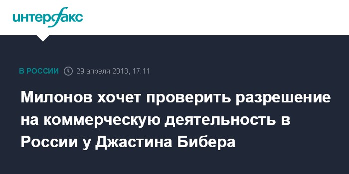 Санкт-Петербург. 29 апреля. INTERFAX.RU - Председатель комитета по законодательству парламента Петербурга Виталий Милонов намерен проверить наличие разрешения на коммерческую деятельность в РФ у Джастина Бибера, который даст концерт в Петербурге во вторник.