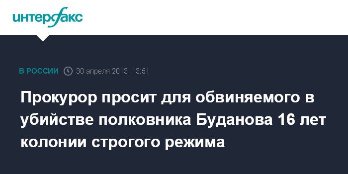 Москва. 30 апреля. INTERFAX.RU - Гособвинение в Мосгорсуде попросило 16 лет колонии строгого режима для Юсупа Темерханова, которого присяжные признали виновным в убийстве экс-полковника Юрия Буданова.