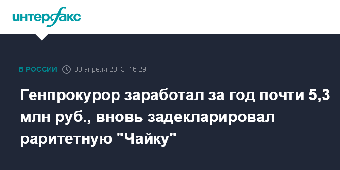 Согласно сведениям о доходах, размещенным на сайте Генпрокуратуры РФ, Чайка в прошлом году заработал 5 млн 293 тыс. 457 рублей. В 2011 г. эта цифра составила 5 млн 643 тыс. рублей.