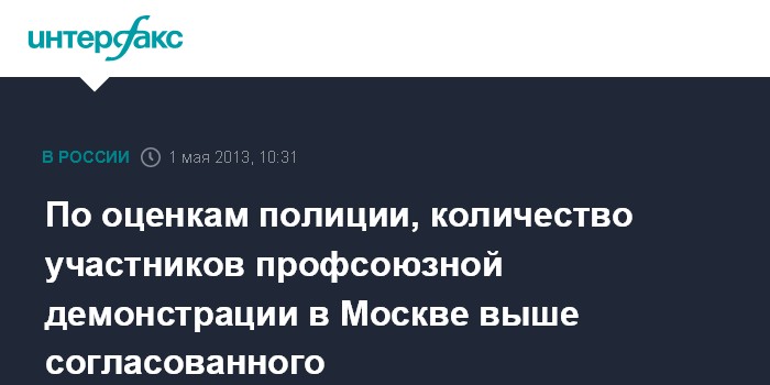 Москва. 1 мая. INTERFAX.RU - Количество участников профсоюзной демонстрации в центре Москвы составляет примерно 70 тысяч человек, сообщили "Интерфаксу" в пресс-службе ГУ МВД России по Москве. "На начало демонстрации по Тверской улице в мероприятии принимают участие около 70 тысяч человек", - сказал сотрудник пресс-службы. Таким образом, организаторы уже превысили согласованные с мэрией Москвы 60 тысяч участников.