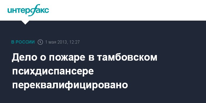 Москва. 1 мая. INTERFAX.RU - Следственные органы приняли решение о переквалификации уголовного дела по факту пожара и гибели пациентки психоневрологического интерната в Тамбовской области на статью "Причинение смерти по неосторожности", сообщает сайт СКР. Ранее дело было возбуждено по статье об уничтожении и повреждении имущества, повлекшем смерть человека.