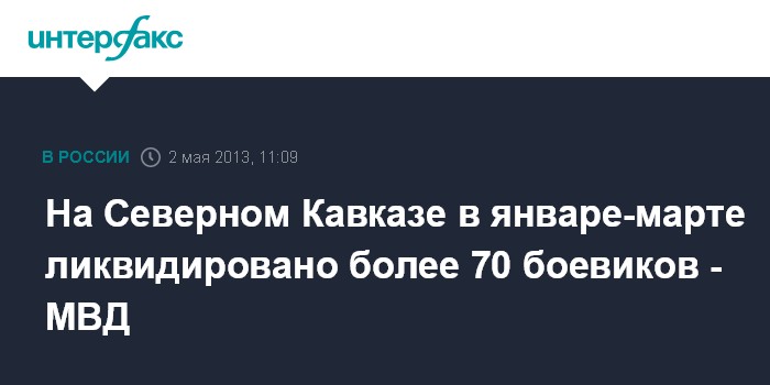 Пятигорск. 2 мая. INTERFAX.RU - В ходе спецопераций в первые три месяца 2013 года в Северо-Кавказском федеральном округе нейтрализовано 73 члена бандподполья, в числе которых 15 главарей боевиков, сообщает пресс-служба ГУ МВД по СКФО.