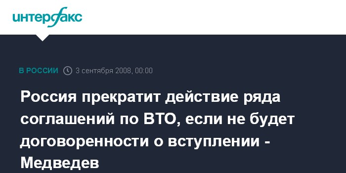 Если в ближайшее время "мы не договариваемся по вопросу о вступлении в ВТО, то вынуждены будем прекратить для себя действия ряда соглашений, которые накладывали на нас дополнительные обязательства в рамках ВТО", сказал Д.Медведев в интервью телеканалу "Евроньюс".