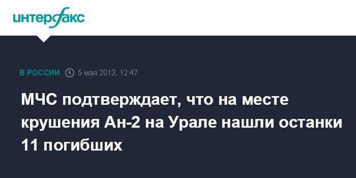 Москва. 5 мая. INTERFAX.RU - МЧС подтвердил обнаружение на месте крушения самолета Ан-2 в Свердловской области тел 11 погибших.