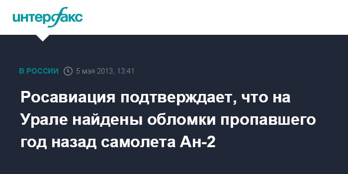 Москва. 5 мая. INTERFAX.RU - Обнаруженные в Свердловской области обломки самолета принадлежат пропавшему год назад "кукурузнику" Ан-2, сообщили "Интерфаксу" в региональном управлении Росавиации.