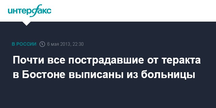 Вашингтон. 6 мая. INTERFAX.RU - Медики в больницах Бостона и его пригородов завершили лечение почти всех людей, получивших ранения в результате теракта на бостонском марафоне, передает в понедельник телеканал NBC.