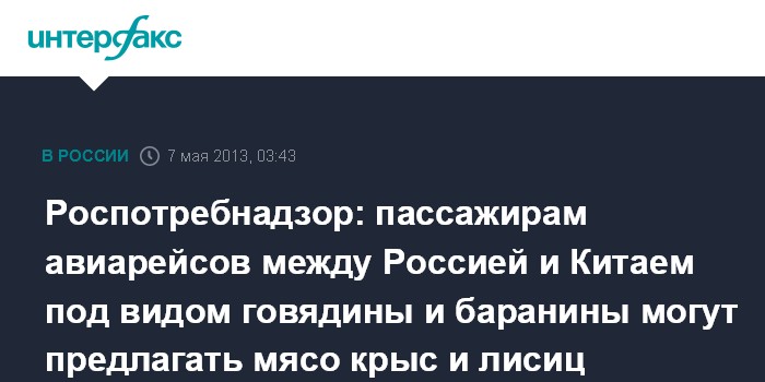 Роспотребнадзор: пассажирам авиарейсов между Россией и Китаем под видом говядины и баранины могут предлагать мясо крыс и лисиц