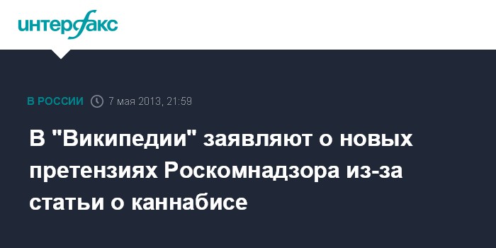 Москва. 7 мая. INTERFAX.RU - Федеральная служба по надзору в сфере связи, информационных технологий и массовых коммуникаций (Роскомнадзор) снова включила в реестр сайтов с запрещенной информацией статью о курении каннабиса в русской версии интернет-энциклопедии "Википедия", сообщил исполнительный директор партнерства "Викимедиа.ру" Станислав Козловский.