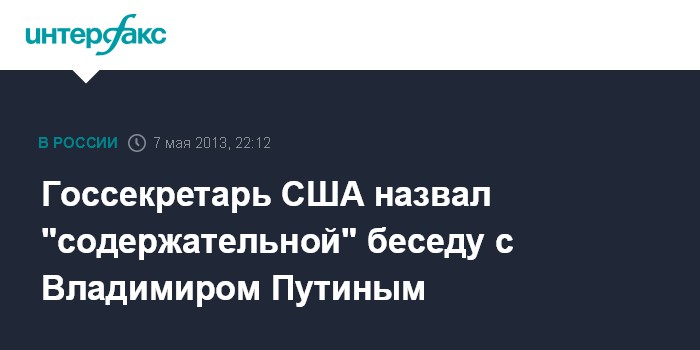 Москва. 7 мая. INTERFAX.RU - Госсекретарь США Джон Керри позитивно отозвался о своих переговорах с президентом России Владимиром Путиным.