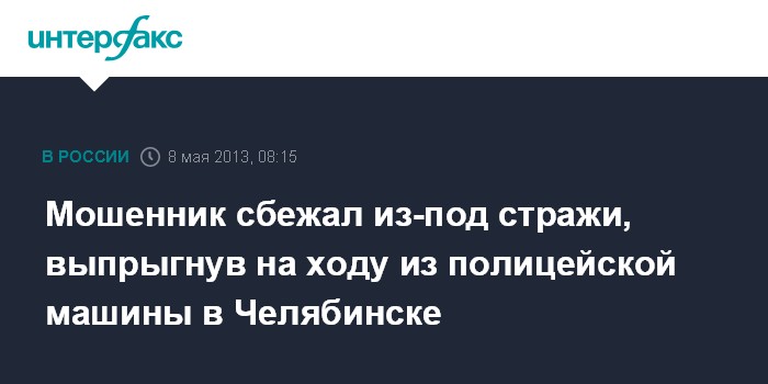 Челябинск. 8 мая. INTERFAX.RU - Обвиняемый в мошенничестве сбежал из-под стражи в Челябинске, сообщает пресс-служба ГУ МВД РФ по Челябинской области.