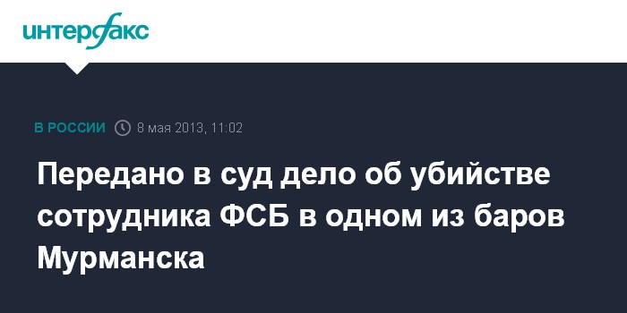 Мурманск. 8 мая. INTERFAX.RU - Уголовное дело по факту убийства офицера спецслужбы в потасовке в мурманском баре "Пилигрим" передано в суд, сообщает пресс-служба СКР Заполярья.