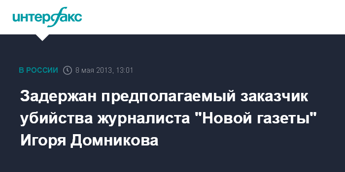 Москва. 8 мая. INTERFAX.RU - Столичные полицейские задержали человека, подозреваемого в заказе убийства журналиста "Новой газеты" Игоря Домникова, сообщили "Интерфаксу" в пресс-службе ГУ МВД России по Москве.