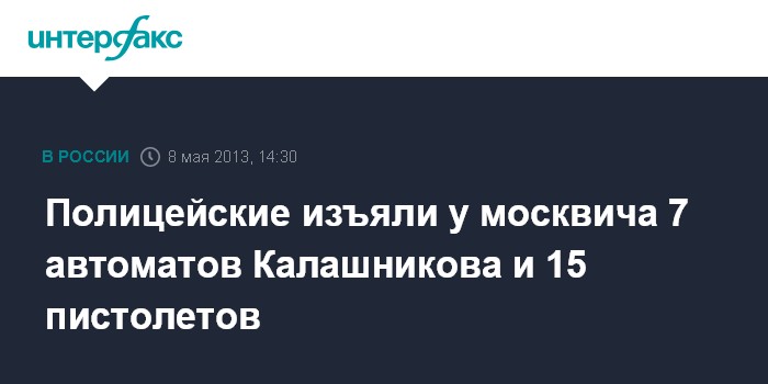 Москва. 8 мая. INTERFAX.RU - Сотрудники Московского уголовного розыска изъяли накануне праздника Победы у 49-летнего москвича внушительный арсенал армейского оружия, купленный им в странах СНГ, сообщили в пресс-службе управления.