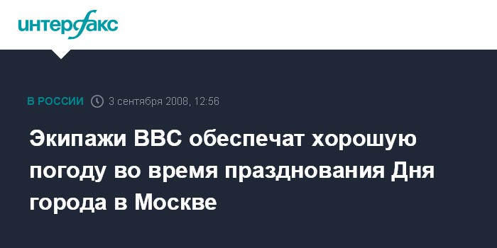 Москва. 3 сентября. INTERFAX.RU - В дни проведения торжеств, посвященных Дню Москвы, для обеспечения благоприятных метеоусловий над столицей Росгидрометом и Военно-воздушными силами России запланированы мероприятия по метеозащите города.
