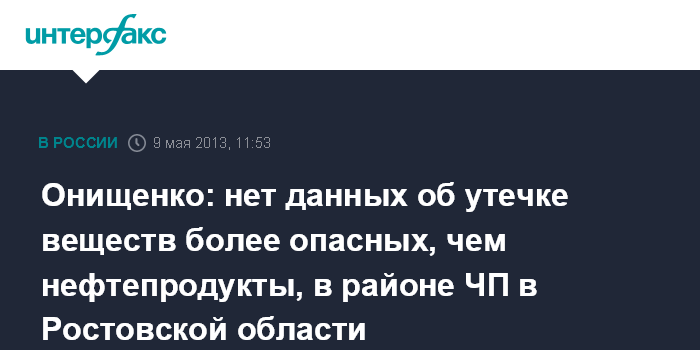 Москва. 9 мая. INTERFAX.RU - У российской санитарной службы нет данных о том, что из железнодорожного состава, сошедшего с рельсов в Ростовской области, помимо нефтепродуктов, произошла утечка более опасных ядовитых веществ.
