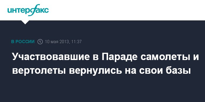 Москва. 10 мая. INTERFAX.RU - Самолеты и вертолеты ВВС России, принимавшие участие в Москве в воздушной части Парада, посвященного Дню Победы, после прохождения в воздушном строю над главной площадью страны взяли курс на аэродромы постоянного базирования, сообщили в пятницу "Интерфаксу-АВН" в Управлении пресс-службы и информации Минобороны РФ. "Все воздушные суда Военно-транспортной, Дальней и оперативно-тактической авиации, а также вертолеты Торжокского авиацентра вернулись на свои аэродромы", - уточнили в Управлении.