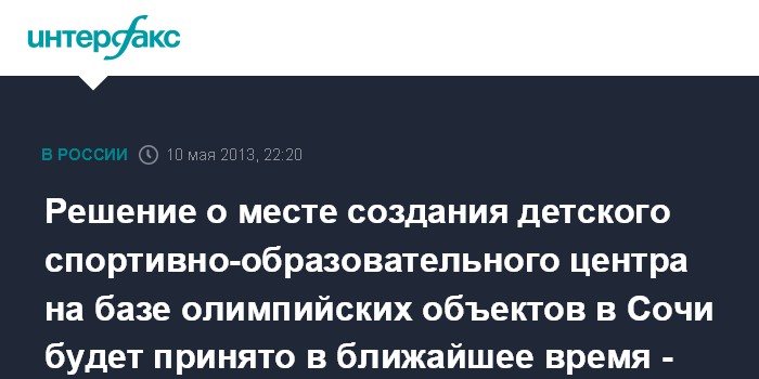 Сочи. 10 мая. ИНТЕРФАКС - Решение о месте создания всероссийского детского спортивно-образовательного центра на базе олимпийских объектов в Сочи будет принято в ближайшее время, сказал пресс-секретарь президента РФ Дмитрий Песков, сообщив о том, что в пятницу Владимир Путин осмотрел предлагаемые варианты размещения комплекса, поручение по которому он давал в марте этого года.