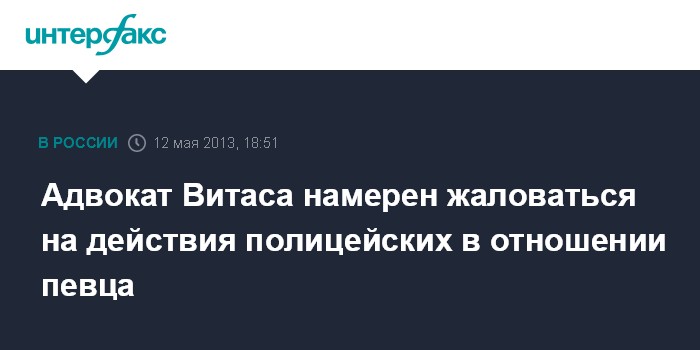 Москва. 12 мая. INTERFAX.RU - Защита российского певца Витаса обратится в полицию с просьбой провести проверку законности действий сотрудников правоохранительных органов, которые, по словам адвоката, после ДТП удерживали артиста в течение пяти часов в наручниках.