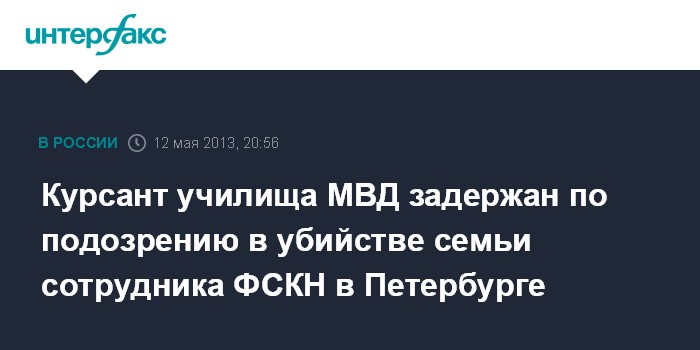 Санкт-Петербург. 12 мая. INTERFAX.RU - Полиция Петербурга раскрыла убийство семьи сотрудника ФСКН, совершенное в воскресенье утром.