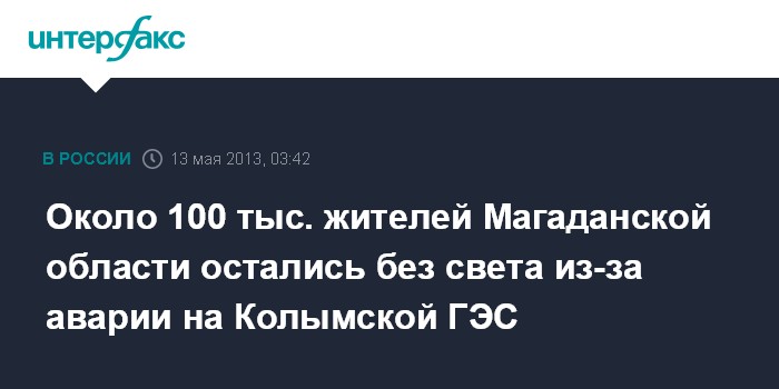 Магадан. 13 мая. ИНТЕРФАКС-ДАЛЬНИЙ ВОСТОК - Жители нескольких районов Колымы и частично Магадана в понедельник утром остались без электричества из-за аварии на Колымской ГЭС.