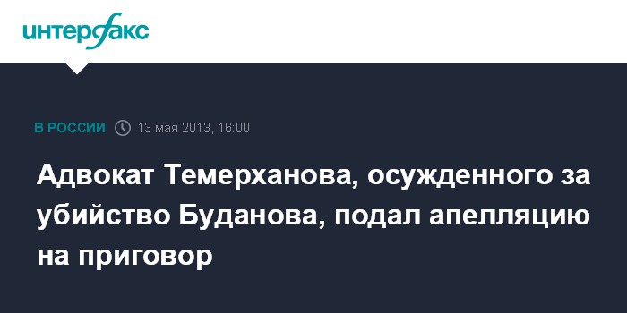 Москва. 13 мая. INTERFAX.RU - Защита Юсупа Темерханова, которому назначили 15 лет колонии строгого режима за убийство экс-полковника Юрия Буданова, обжаловала приговор.