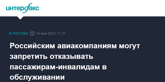 Москва. 14 мая. INTERFAX.RU - Авиаперевозчикам и аэропортам РФ могут запретить отказывать в обслуживании пассажирам с ограниченными возможностями, сообщает "Российская газета" во вторник.