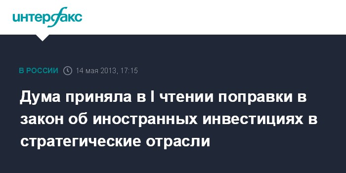 Москва. 14 мая. INTERFAX.RU - Госдума на заседании во вторник приняла в первом чтении законопроект, направленный на либерализацию процедур контроля за осуществлением иностранных инвестиций в хозяйственные общества, имеющие стратегическое значение, а также на устранение излишних административных барьеров для иностранных инвесторов при совершении ими сделок.