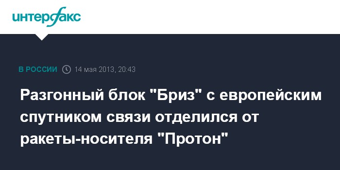 Москва. 14 мая. INTERFAX.RU - Орбитальный блок в составе разгонного блока "Бриз-М" и европейского спутника связи W3D успешно отделился от ракеты-носителя "Протон-М" и вышел на суборбитальную траекторию, сообщил во вторник "Интерфаксу" представитель Государственного космического научно-производственного центра (ГКНПЦ) имени Хруничева Александр Бобренев. "Отделение орбитального блока произошло в 20:11 по московскому времени", - уточнил он.