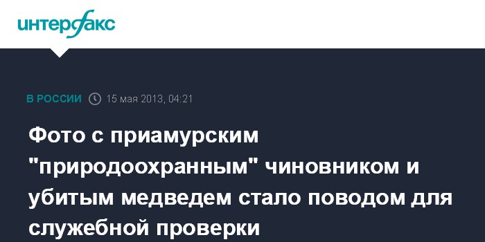 Благовещенск. 15 мая. ИНТЕРФАКС-ДАЛЬНИЙ ВОСТОК - В отношении главы "природоохранного" управления администрации Амурской области, который запечатлен на фото с убитым медведем, проводится проверка, сообщает в среду официальный сайт правительства региона.